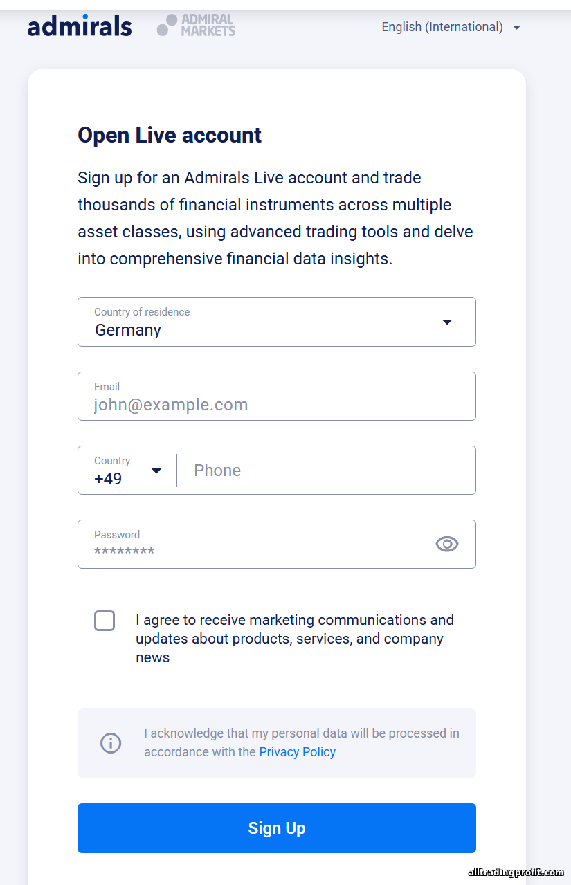 - Admirals demo hesap. Herkes, pratik yapmak için ücretsiz MT4/MT5 demo açabilir (genellikle 30 gün, tipik sanal bakiye 10.000 $). Destek, demoyu uzatabilir veya yeniden açmanıza izin verir; böylece istediğiniz kadar çalışabilirsiniz. Demo, canlı koşulları — spread ve kotasyonları — yansıtır; platformu öğrenmek ve strateji testlemek için idealdir.
