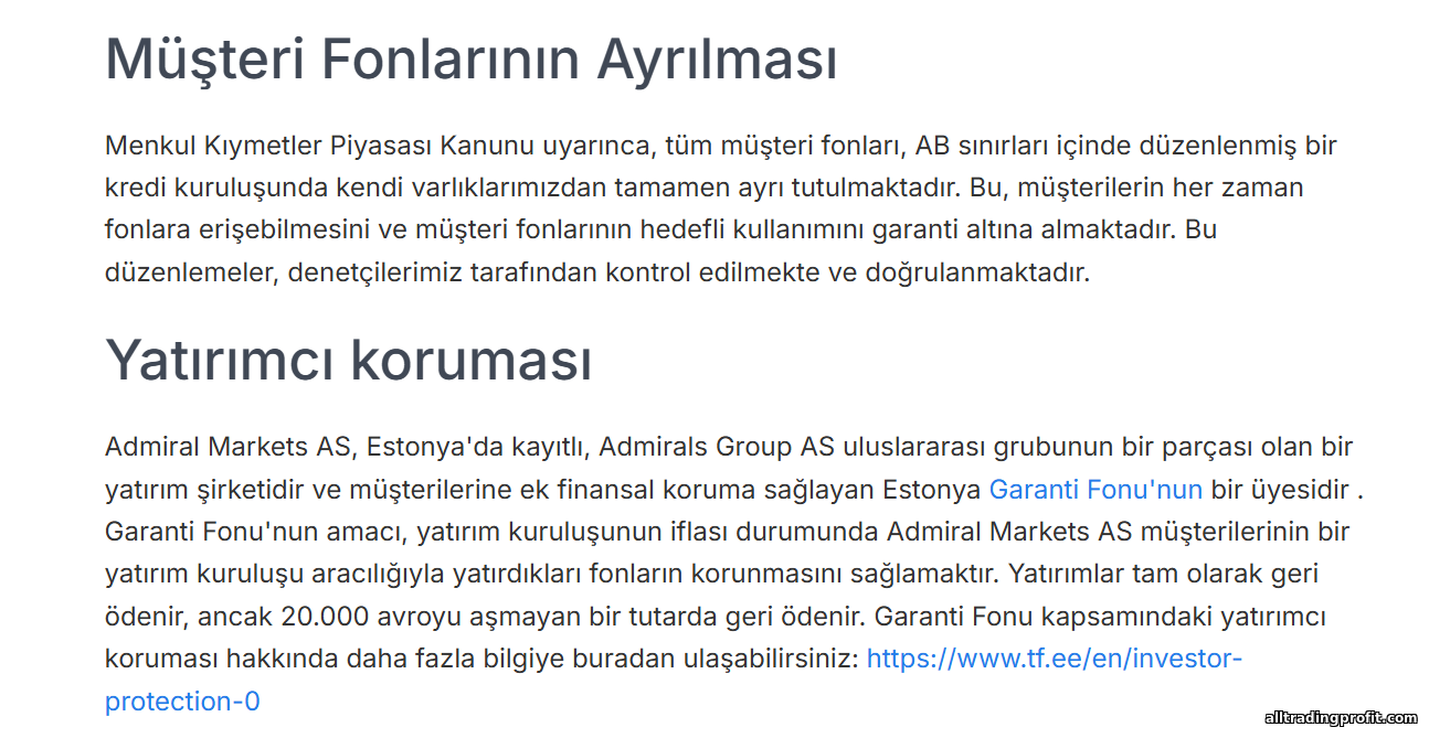 - Profesyonel sorumluluk sigortası. Admirals, broker hatasından doğan belirli zararları kapsayan, müşteri başına 100.000 €’ya kadar (Lloyd’s dahil) profesyonel sorumluluk sigortası yaptırır. Her broker bu korumayı sunmaz.