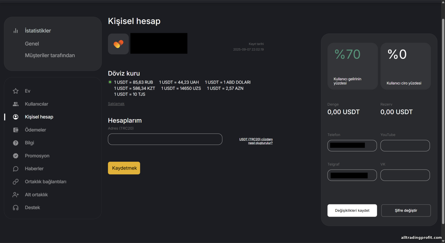 - Yüksek RevShare yüzdesi. Broker kârının %70’ine kadar üst sınır — ikili opsiyon alanında en yüksekler arasında. Bu cömert pay, ortakların getirdikleri müşterilerden şirket gelirinin büyük kısmını alması demektir. Birçok rakip benzer yüzdeler listeler ama hepsi pratikte sunamaz. %50–60 standart bile güçlüdür. Sektör ortalaması ~%50, %70 genelde üst performans içindir. BinTrade’ın mesajı şu: “kullanıcı getir — gelirin yarısından fazlasını paylaşalım.”