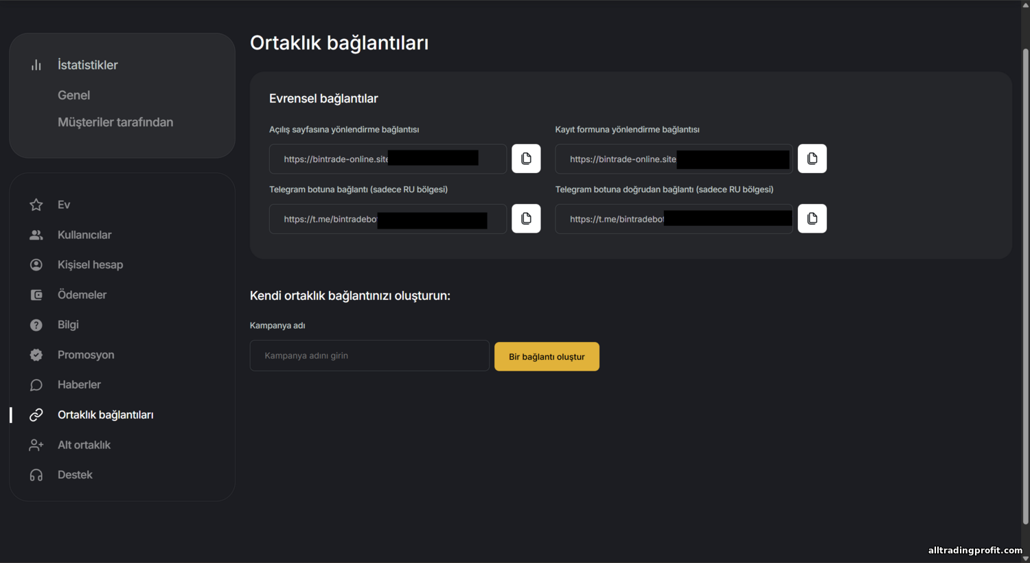 - Adım 3. Yönlendirme linkleri ve materyalleri alın. Panele girince benzersiz yönlendirme linkinizi üretin. Genelde ana sayfada görünür — https://bintradeclub.ru?ref=your_ID gibi. Bu linke tıklayıp kayıt olan herkes size bağlanır. Program ek linkler (sub‑ID) oluşturmanıza izin veriyorsa farklı kanallar için kullanın. “Promo” bölümünde farklı boyutlarda banner’lar bulunur; indirin veya kodunu kopyalayın. Hazır landing sayfaları da olabilir — trafiğinize uygun olanı seçin. İngilizce kitle için İngilizce kreatifleri kullanın (BinTrade sitesi en az Rusça ve İngilizce mevcuttur). Link ve banner kodlarını kopyalayın — bir sonraki adımda kullanacaksınız.