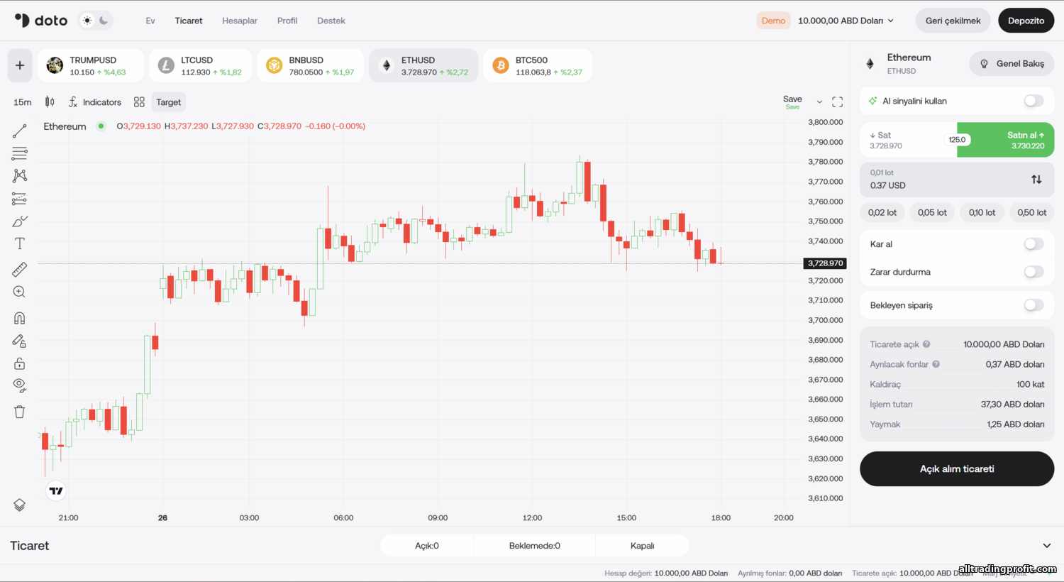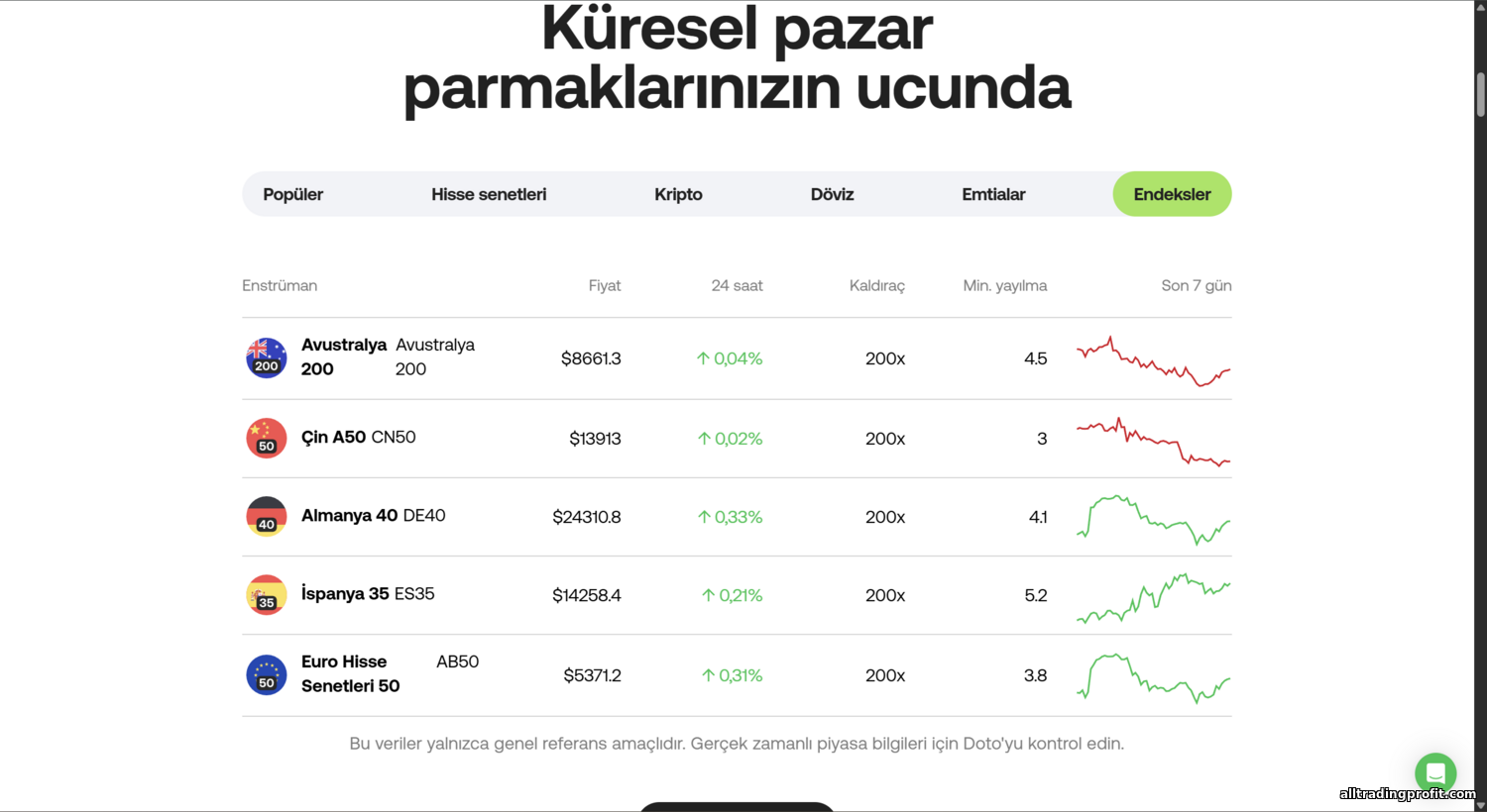 - Hisseler (CFD): Bu içerik hazırlanırken Doto, komisyonsuz hisse CFD’lerini eklemeye hazırlanıyordu. Popüler ABD ve Avrupa hisselerinin (Apple, Tesla, Amazon vb.) yakın zamanda listelenmesi bekleniyor.