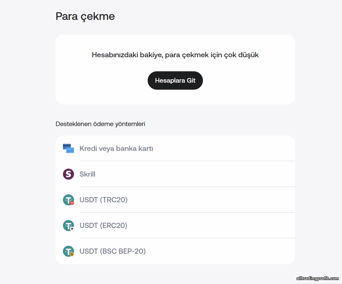 - Mevduat yatırın. Canlı işlem için fon yatırın. Minimum \$15’tir—banka kartları bile bu küçük tutarı destekler. Yöntemi seçin (kart, e-cüzdan, kripto—ayrıntılar sonraki bölümde) ve yönergeleri izleyin. Çoğu yöntem anında veya 15 dakika içinde bakiyeye yansır. Yatırım yaptıktan sonra bakiye görünür ve işlem yapmaya başlayabilirsiniz.