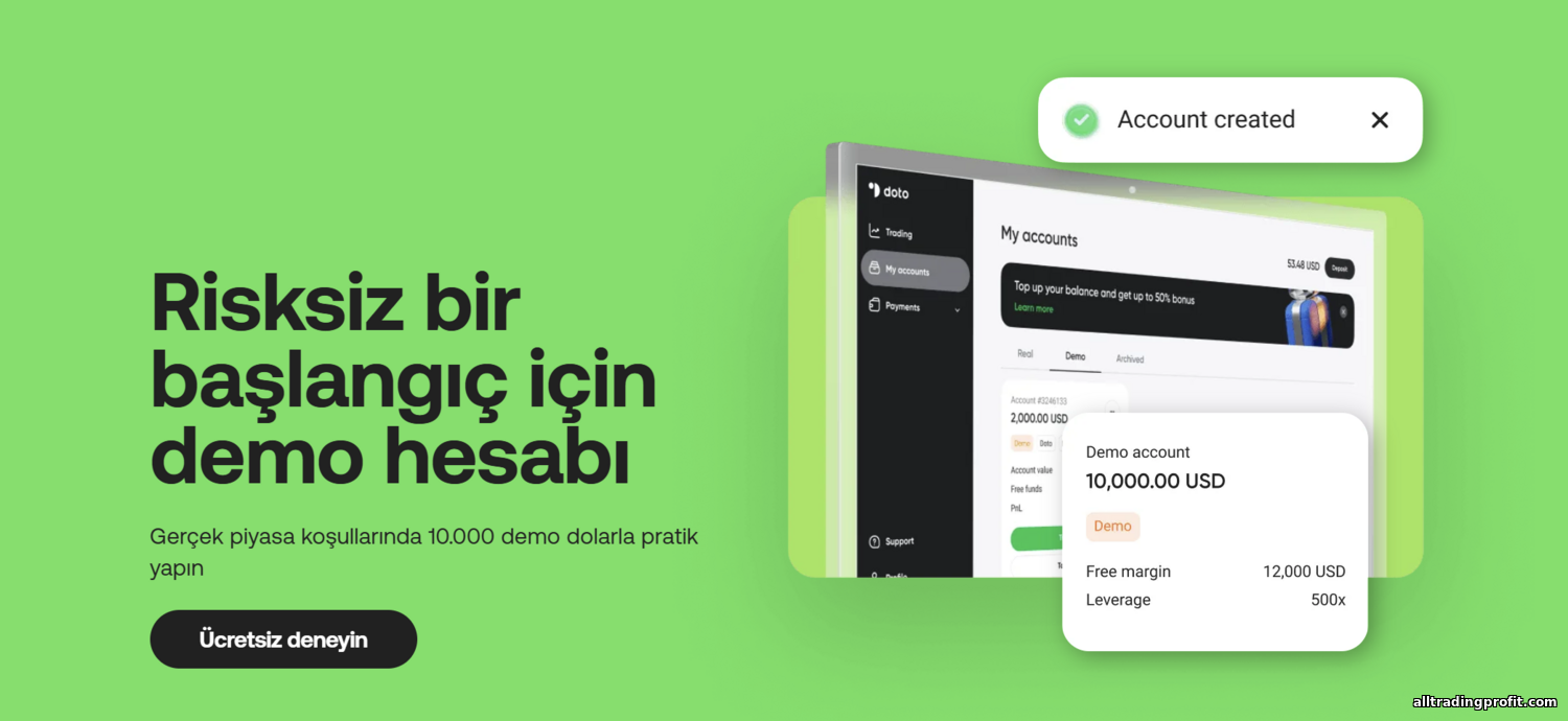 Hepsi bu—Doto’da hesap açmak gerçekten basit. Kişisel deneyim: kayıt, doğrulama ve fonlama yaklaşık bir gün sürdü (en uzun kısım belge incelemesi) ve ertesi gün ilk canlı işlemimi yaptım. Doto bazen giriş kolaylığı için promosyonlar düzenler—örneğin ilk yatırma bonusu (yüzde 50’ye kadar), ancak bonusu çekmeden önce belirli hacme ulaşmanız gerekir. Demo hesap kayıt anında otomatik açılır, böylece evrak olmadan hemen sanal işlem yapabilirsiniz.