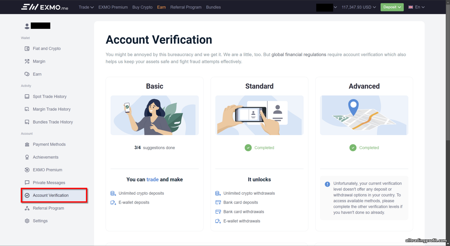 Ancak tam işlem (alım-satım, para yatırma ve çekme) yapabilmek için kimlik doğrulaması zorunludur. EXMO, sıkı KYC kurallarını izlediği için anonim olarak varlık çekmek mümkün değildir. Doğrulama, farklı aşamalardan (seviye) oluşur ve her aşama ek özellikler açar: