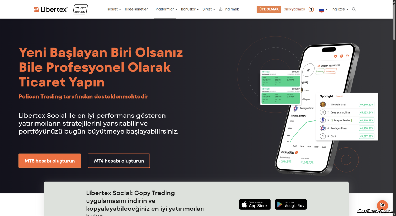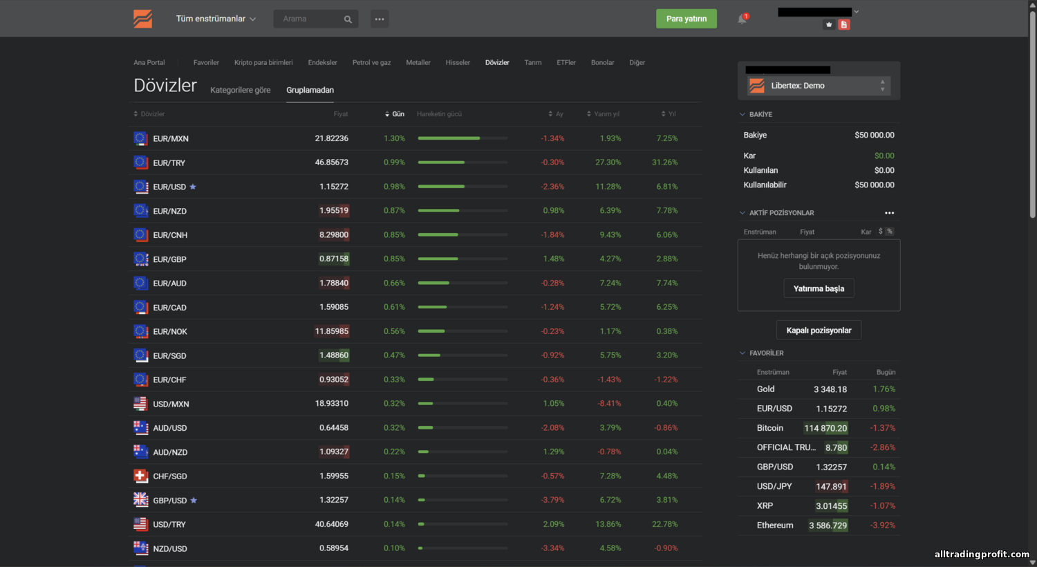 - Libertex — özgün web platformu ve mobil uygulama. 2015’te Forex Club tarafından geliştirildi; defalarca en iyi işlem platformları arasında gösterildi. Libertex’in ayırt edici özelliği, geleneksel spreadin sıfır olmasıdır. İşlemi piyasadan, üzerine ekleme olmadan açarsınız; aracı kurum sabit bir komisyon alır (genellikle işlem tutarının %0,03’ü). Model şeffaftır: ücreti işlemin para biriminde anında görürsünüz. Lot ve kaldıraç yerine “çarpan” belirlersiniz — fiilen pozisyon büyütücüdür (FX’te x500’e kadar). Yeni başlayanlar için daha basittir: risk, pozisyona yatırılan tutarla sınırlıdır; bir işlemde yatırdığınızdan fazlasını kaybedemezsiniz. Minimum tutar 10 $’dır; grafikler onlarca göstergeyle etkileşimlidir, haber uyarıları bulunur. Tek tıkla işlem desteklenir; akıllı telefon deneyimi akıcıdır ve arayüz sade tutulmuştur. Birçok kullanıcı Libertex’i “ilk kez işlem yapana bile anlaşılır” bulur. Google Play’de bir yorum şöyle der: “Arayüz harika, her şey elinizin altında ve net. Uzun süre işlem yaptım; artılarını takdir ediyorum.”