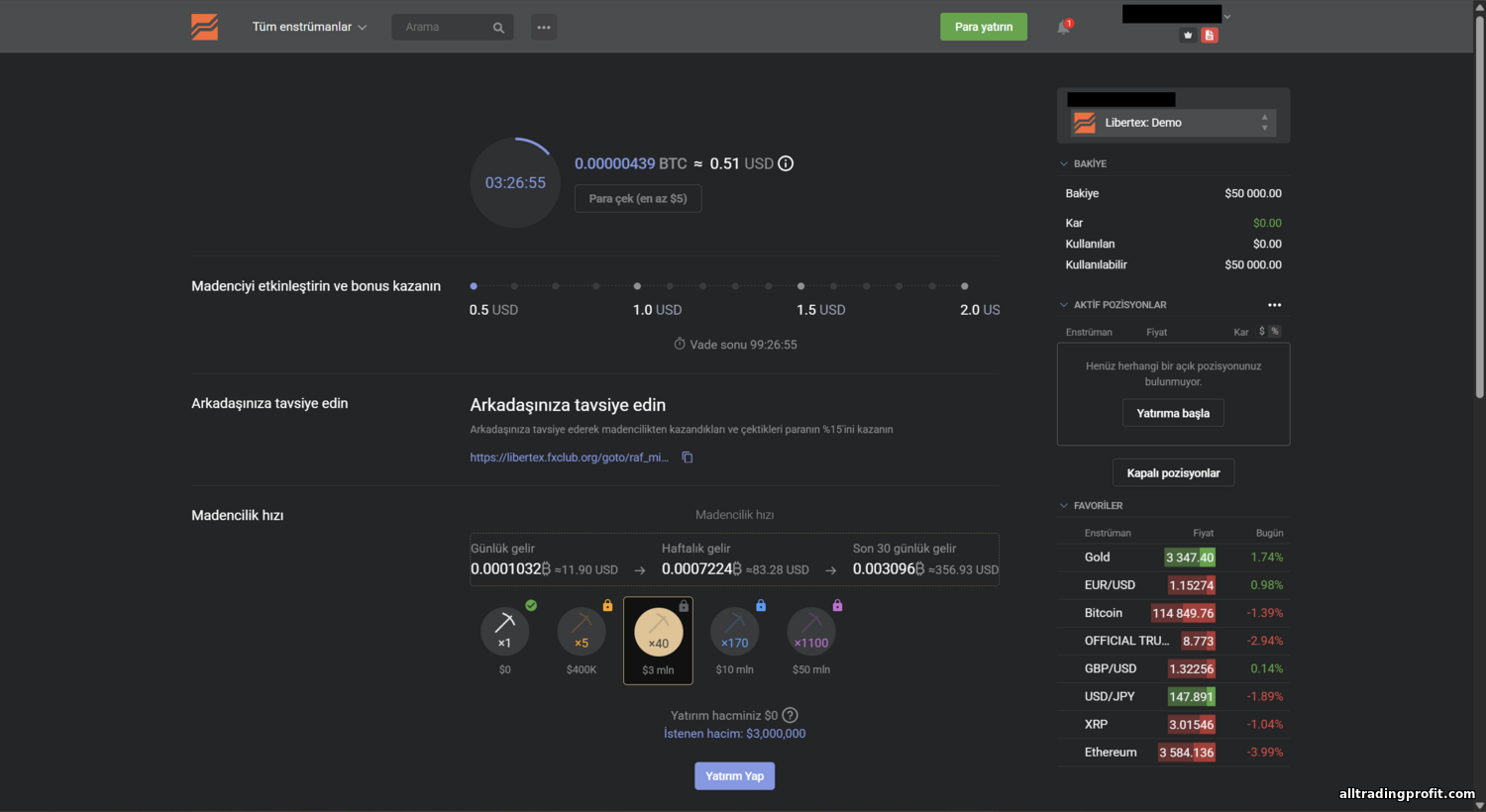- Libertex Hesabı. Libertex platformu üzerinden işlem içindir. Özellikler: enstrümanlarda sıfır spread (0,0 pip) ve işlem başına komisyon. Ücret çok düşüktür — işlem tutarının yaklaşık %0,03’ü (varlığa göre değişir). Örneğin 1.000 $’lık EUR/USD alımı ~0,30 $ maliyetlidir. Pip cinsinden ~0,1 pip eder — çoğu rakibin spread’inden ucuzdur. Etkin bir minimum depozito yoktur — 1 $’dan başlanabilir; bu da acemiler için caziptir. Kaldıraç (çarpan) FX’te 1:500’e kadardır. Emirler piyasa fiyatından (Market Execution) neredeyse anlık yürütülür. Libertex klasik swap eklemez — gece taşıma maliyeti bir günü aşan pozisyonlarda komisyona gömülüdür. Basitlik ve şeffaflık isteyenler için idealdir: işlemi onaylamadan önce tam komisyonu görürsünüz; gizli ücret yoktur. Libertex hesapları sıkça bonus da alır — örneğin hoş geldin depozito bonusu (aşağıya bakın).