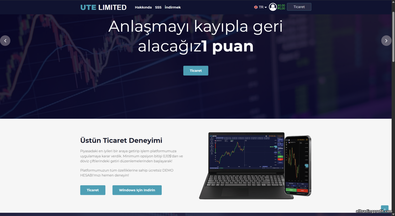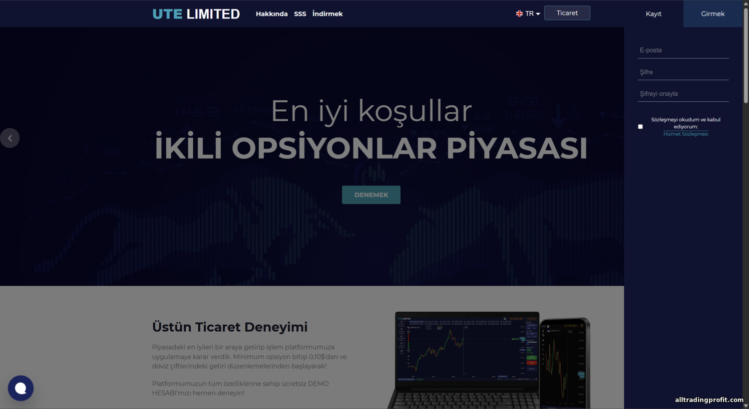 İkili opsiyon işlem platformu UTE Limited, 2023–2024’te agresif reklamlar ve iddialı vaatlerle dikkat çekti. Proje, %90’a varan getiriler ve düşük giriş eşiğiyle modern bir dijital opsiyon ortamı olduğunu öne sürüyor. Ancak ödenmeyen para şikâyetlerinden lisans ve şeffaf kurumsal verilerin yokluğuna kadar uyarı işaretleri şimdiden belirdi. Bu inceleme, UTE Limited’i kapsamlı biçimde ele alıyor: genel şirket bilgileri, site ve platform denetimi, işlem koşulları, hesap türleri, kayıt süreci, ortaklık programı, destek ve topluluk kalitesi ile güvenlik ve düzenleme. Ayrıca gerçek kullanıcı geri bildirimlerini aktarıyor ve UTE Limited’i Quotex, Binarium ve Olymp Trade gibi rakiplerle kıyaslayarak broker’ın sektör standartlarını karşılayıp karşılamadığını değerlendiriyoruz.