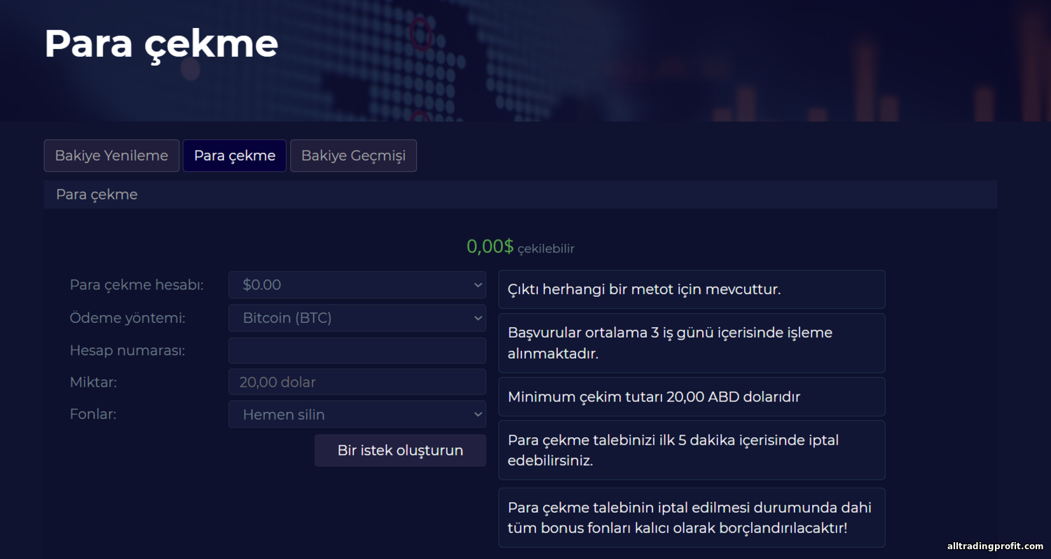 Kayıt sonrası trader paneline erişim sağlanır. Kullanıcılara göre arayüz oldukça sade. Başlıca bölümler bakiye yatırma, çekim, işlem ve finans geçmişi, profil ayarları ve destek (genellikle yalnızca bir destek e‑postası) şeklindedir.