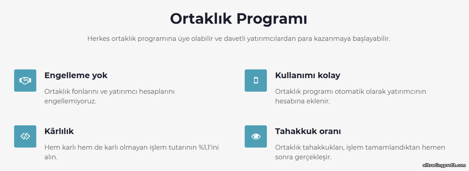 UTE Limited, kendi yönlendirme programını işletiyor; bu şaşırtıcı değil: lisanssız çevrimiçi brokerların çoğu, müşteri kazanımını agresif biçimde ortak ağları üzerinden yapar. Ana sayfada programa katılmaya davet eden bir banner var. Bu bile brokerın, pazarlama maliyetlerini en aza indirip işi kullanıcılara ve dijital pazarlamacılara kaydırarak kitlesini genişletmeyi hedeflediğini gösterir.