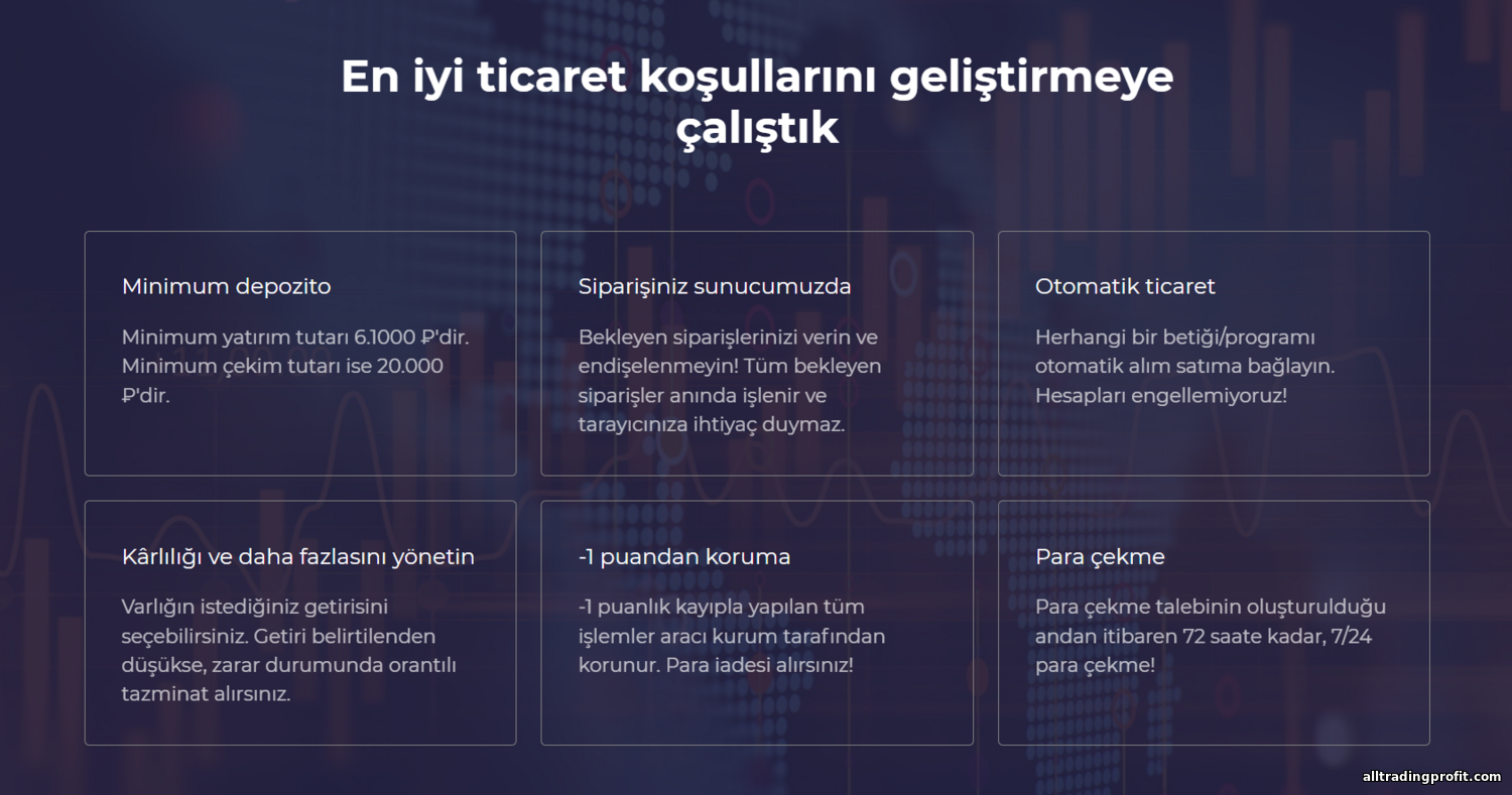 Kısacası, UTE Limited sitesi yeterince olgunlaşmamış bir ürün izlenimi veriyor. Temel ikili opsiyon işlevini sağlasa da olgun ticaret platformlarının gerisinde. Mobil uygulama eksikliği, sınırlı analiz ve dönemsel kesintiler ciddi kusurlar; teknik risklere—işlemlerin yarıda kesilmesinden sistem arızaları yüzünden para kaybına—kapı aralıyor. Sırada brokerın rekabet avantajı olarak pazarladığı işlem koşulları var.
