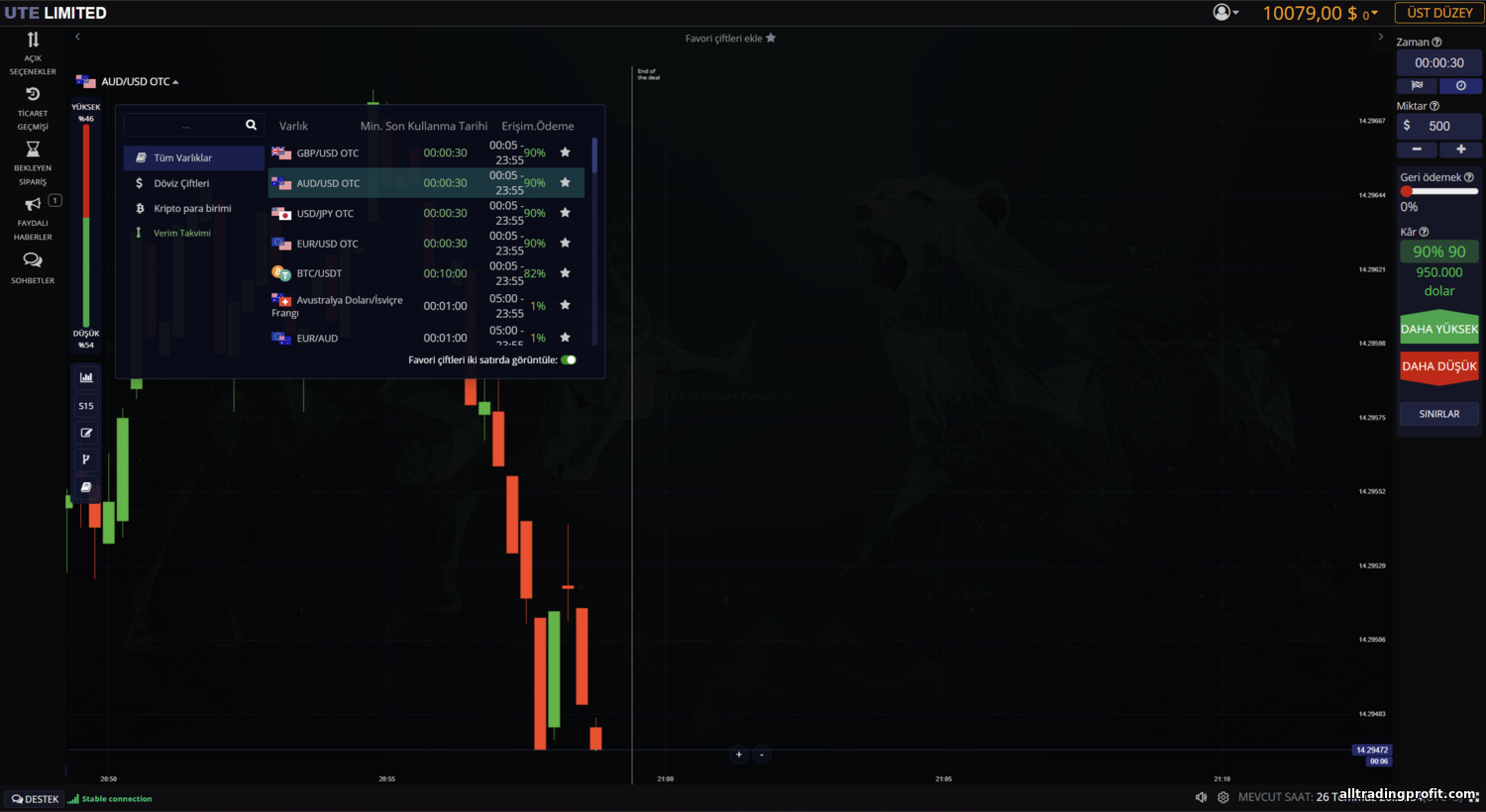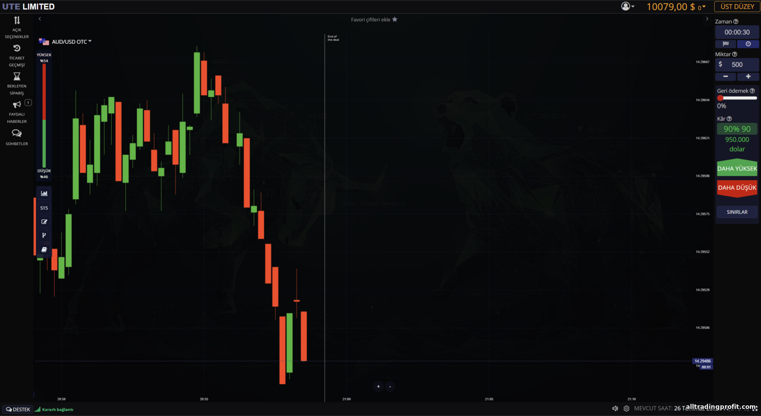 - Vade süreleri: UTE Limited sitesinde spesifik vade aralıkları açıkça belirtilmiyor; ancak standart skalayı sunduğunu varsaymak mantıklı—ultra kısa 1 dakikalık işlemlerden birkaç saat süren pozisyonlara kadar. İkili opsiyonlarda geleneksel vadeler 1, 5, 15 dakika, 1 saat vb.dir; UTE Limited’in istisna olması beklenmez. Yorumlarda olağandışı bir kısıtlama belirtilmediğine göre, trader’lar fiyat yönü üzerine esnek zaman dilimleri seçebiliyor.