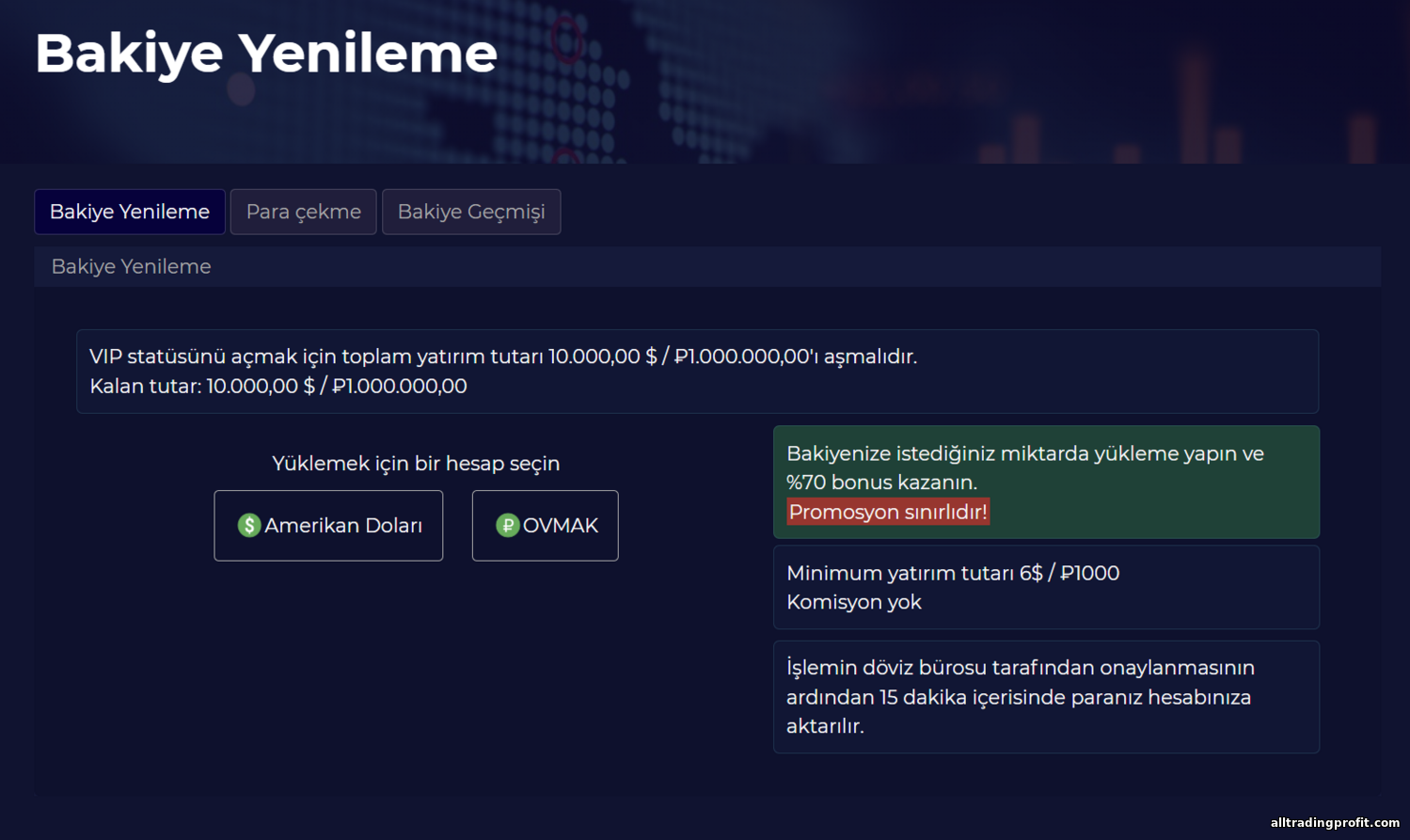 - Komisyon ve spread: Klasik ikili opsiyon modelinde (UTE Limited’in de uyguladığı) spread veya işlem başına komisyon yoktur—broker kazancını getiri yüzdesi üzerinden (kazanan işlemlerde %100’ün altında ödeme yaparak) elde eder. Bu nedenle ayrıca işlem ücreti alınmaz. Bununla birlikte, para yatırma/çekme ücretleri olup olmadığını netleştirmek önemlidir. Bu rakamlar sitede açıkça yayımlanmamış; büyük olasılıkla yatırımlar ücretsizdir (veya ödeme sisteminin kesintisine tabidir), çekimlerde ise özellikle belirli bir işlem hacmine ulaşmadan nakde çevirme durumunda sabit veya yüzdesel ücret uygulanabilir. Bu konuya çekim bölümünde döneceğiz.