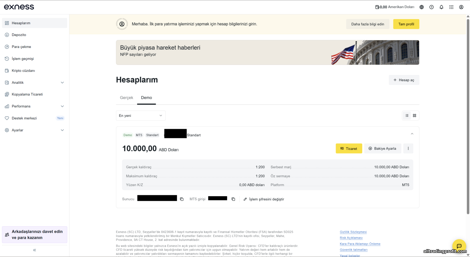 - Demo: canlı hesapların yanı sıra Exness sınırsız süreli ücretsiz demo sunar. İstenilen türde (Standard, Pro vb.) sanal bakiyeyle (varsayılan 10.000 $, ayarlanabilir) açılabilir. Kotasyonlar ve koşullar canlıya yakındır.