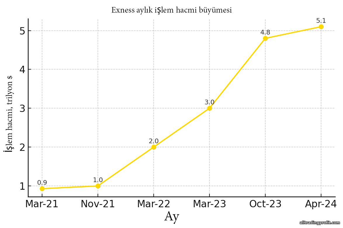 Exness’in aylık işlem hacmi artışı (trilyon USD), 2021’den 2024’e hızlı genişlemeyi gösterir.