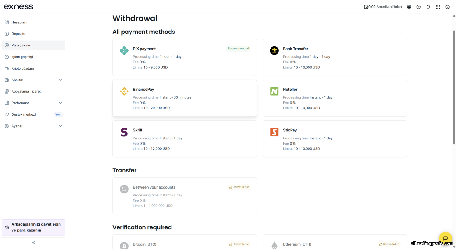 - Hızlı para yatırma/çekme: 7/24 anında kâr çekimleri — fonlar e‑cüzdanlara gece gündüz dakikalar içinde ulaşır. Exness, az sayıda rakibin erişebildiği otomatik ödeme işleme sistemine sahiptir.