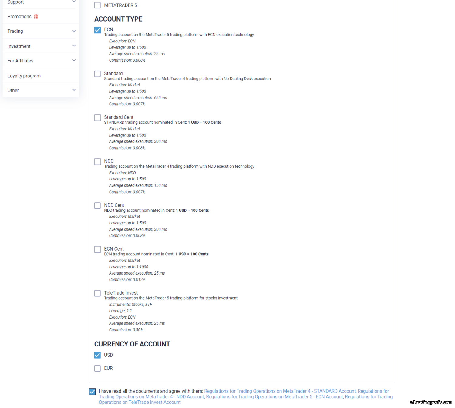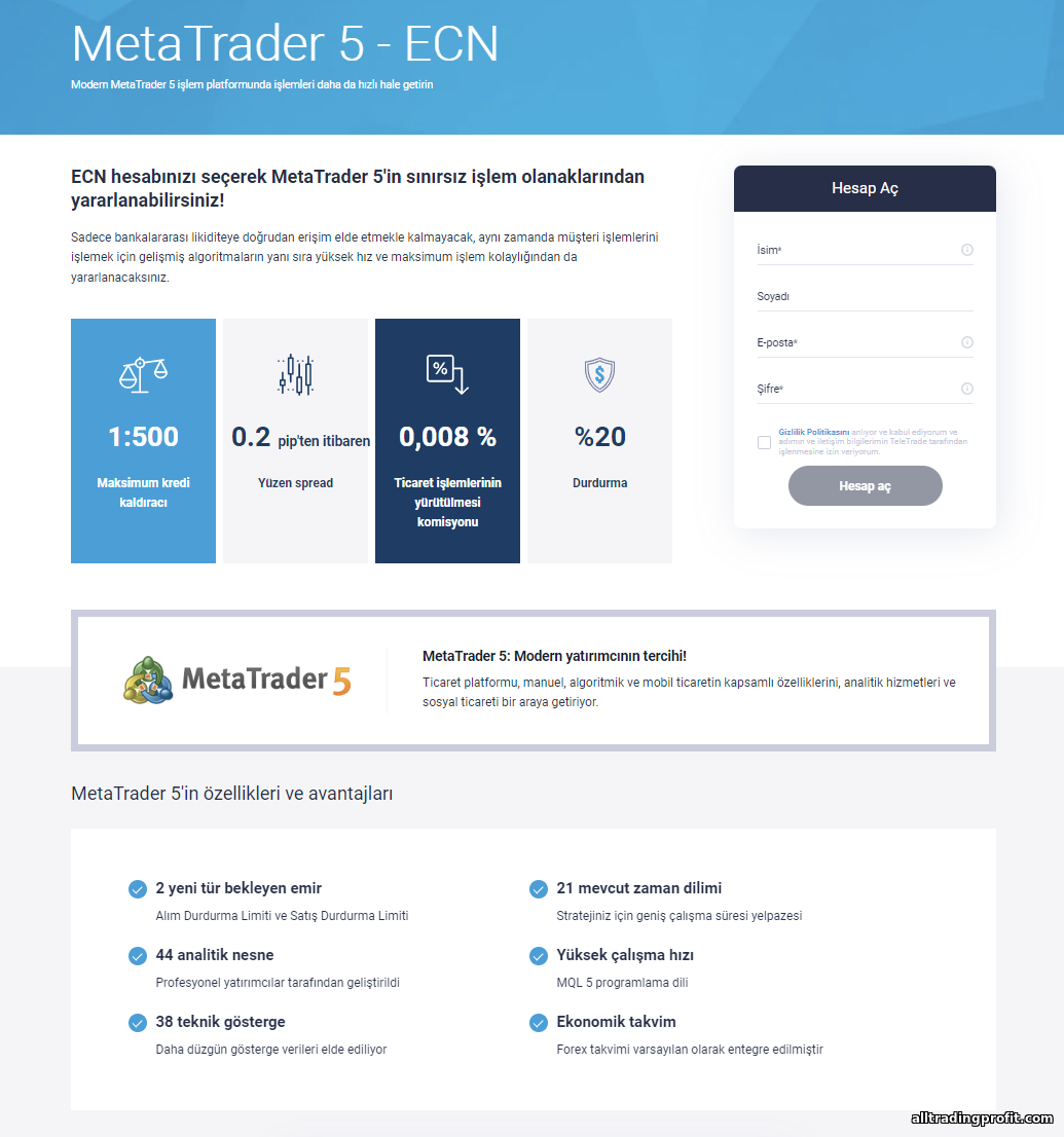 - MT5 ECN: MetaTrader 5 üzerinden ECN (Electronic Communication Network) modelinde işlem yapmak isteyen tecrübeli yatırımcılara yönelik. Spread 0,2 pip’ten başlar, komisyon %0.008 (~8 USD tek yön, 16 USD gidiş-dönüş). Bazı rakipler (AMarkets, Alpari vb.) 3–5 USD gibi daha düşük komisyonlar sunar; bu açıdan TeleTrade biraz pahalı kalabilir. Ancak ham (raw) spreadler kısa vadeli ve haber işlemleri için avantaj sağlayabilir. Kaldıraç 1:500, stop-out seviyesi %20, minimum depozito çoğunlukla 100–200 USD civarında.