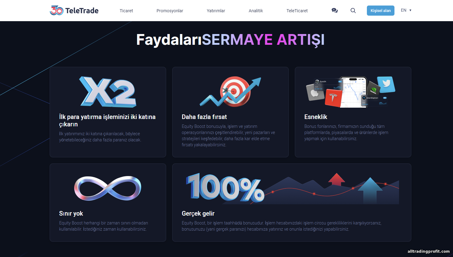 Böylece TeleTrade portföyü, önde gelen çok varlıklı brokerlarla kıyaslanabilecek düzeydedir. Tek platformdan EUR/USD, petrol, Apple hissesi, Bitcoin gibi farklı piyasalara ulaşmak mümkündür. Bu çeşitlilik, döviz piyasası veya hisse senetleri arasında geçiş yapmak isteyenlere avantaj sağlar.