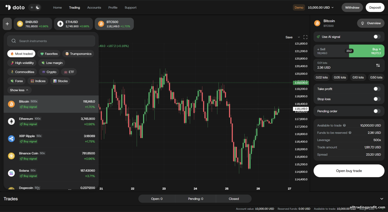 - Doto – Daha yeni ama hızlı büyüyen, ödüller almış bir broker (ör. “Best CFD Broker 2025”). Birkaç yargı alanında düzenlemeye tabidir (CySEC, FSCA vb.), MT4/MT5 ve TradingView entegrasyonlu kendi platformunu sunar. Artılar: düşük giriş ($15), geniş piyasa yelpazesi (forex, hisseler, emtialar, ETF’ler, kripto CFD’ler). Eksiler: cent hesap yok ve uzun süreli hareketsizlikte olası ücret.